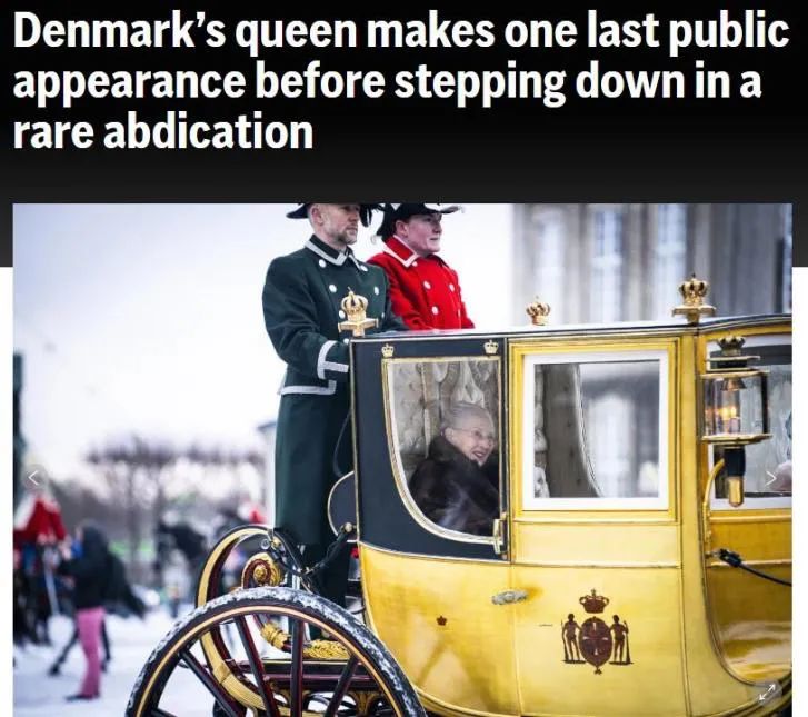 當地時間1月4日,是丹麥女王瑪格麗(li) 特二世最後一次以君主身份公開露麵。現年83歲的女王乘坐“金馬車”穿過丹麥首都,不少民眾(zhong) 冒著嚴(yan) 寒、強風和雨雪,在沿途為(wei) 她揮舞旗幟並歡呼。