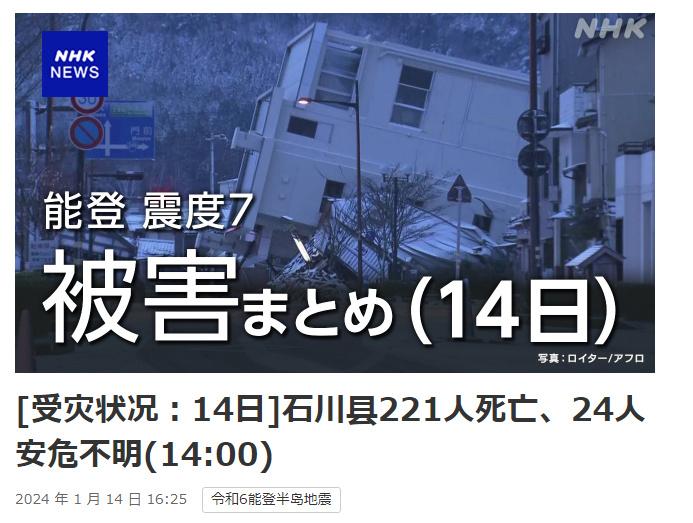 中新網1月14日電 據日本廣播協會(hui) (NHK)報道,日本石川縣最新統計數據顯示,截至當地時間14日下午2時,日本石川縣能登地區1日發生的7.6級地震已造成221人遇難。