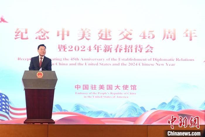 當地時間1月16日,中國駐美國使館舉(ju) 辦紀念中美建交45周年暨新春招待會(hui) 。圖為(wei) 中國駐美大使謝鋒致辭。中新社記者 陳孟統 攝