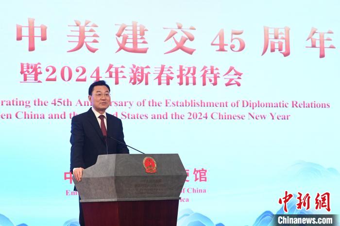 當地時間1月16日,中國駐美大使謝鋒在華盛頓舉(ju) 辦的紀念中美建交45周年暨新春招待會(hui) 上致辭。中新社記者 陳孟統 攝