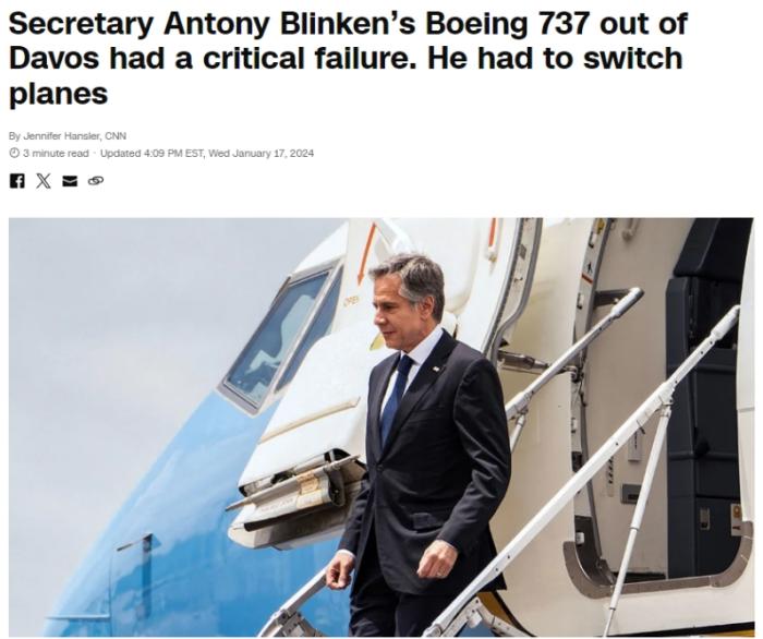 中新網1月18日電 據美國有線電視新聞網(CNN)報道,當地時間1月17日,美國國務卿布林肯參加完達沃斯論壇從(cong) 瑞士蘇黎世返程時,其乘坐的波音737飛機出現“嚴(yan) 重故障”。