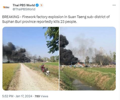 另據泰國公共廣播服務公司下屬新聞網站“Thai PBS World”社交媒體(ti) 賬號消息,當地時間17日,泰國中部素攀武裏府一家煙花廠爆炸,目前已造成23人死亡,多人受傷(shang) 。