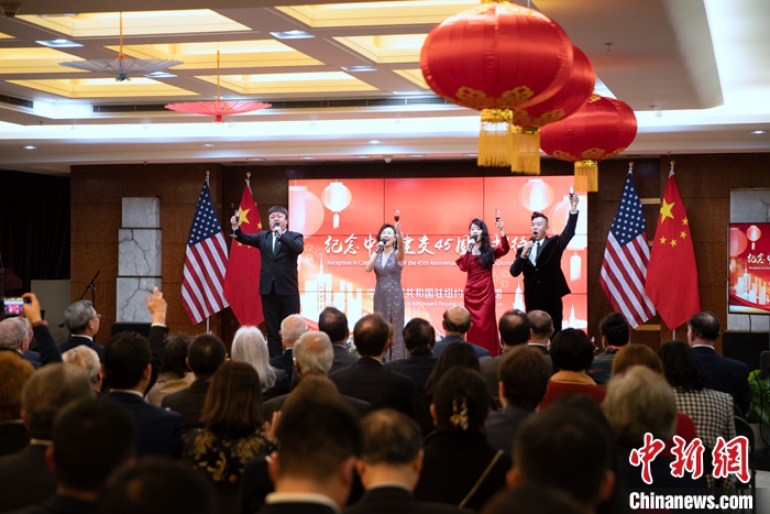 當地時間1月17日,中國駐紐約總領館舉(ju) 行中美建交45周年招待會(hui) 。圖為(wei) 現場表演美聲聯唱《為(wei) 祖國幹杯》《飲酒歌》。 中新社記者 廖攀 攝