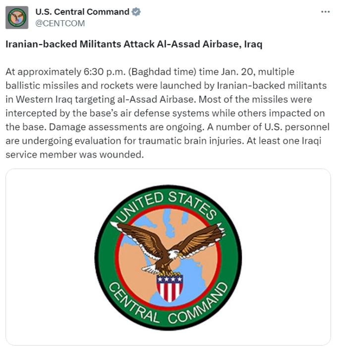 據報道,美國中央司令部在一份聲明中稱,伊朗支持的武裝分子20日在伊拉克西部,向阿薩德空軍(jun) 基地發射了多枚彈道導彈和火箭彈,其中大部分導彈被基地的防空係統攔截,其他則擊中了基地。