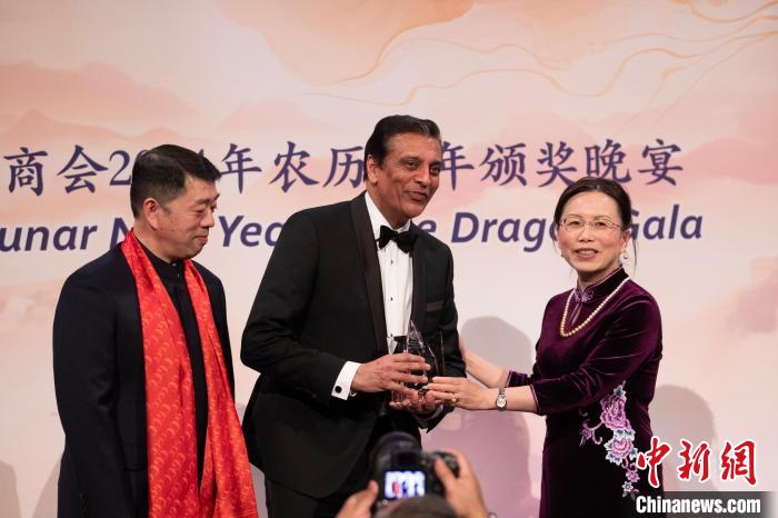當地時間1月18日,美國中國總商會(hui) (CGCC)在紐約舉(ju) 行2024年農(nong) 曆龍年頒獎晚宴。圖為(wei) 中國駐美國大使館公使徐學淵(右)為(wei) 聯邦快遞總裁兼首席執行官拉傑·蘇巴馬廉(中)頒發“國際領導力獎”。 中新社記者 廖攀 攝