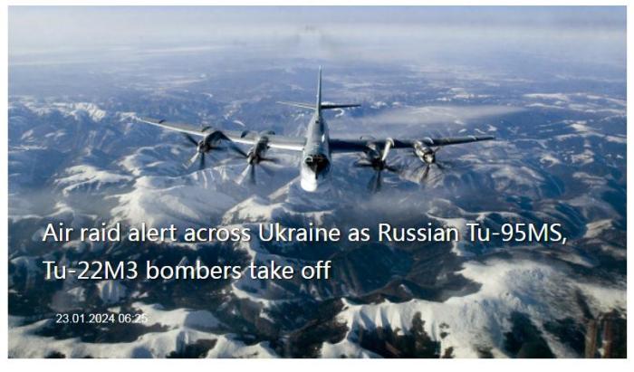 中新網1月23日電 據烏(wu) 通社23日報道,烏(wu) 克蘭(lan) 全境拉響防空警報。報道稱,烏(wu) 克蘭(lan) 空軍(jun) 記錄到當地時間23日早些時候,多架圖-95轟炸機和圖-22轟炸機從(cong) 俄羅斯起飛。