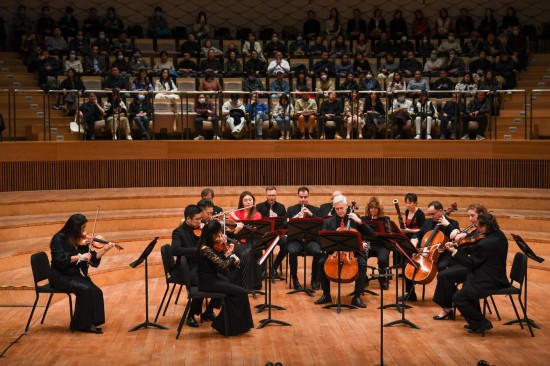 這是2023年11月16日拍攝的音樂(le) 會(hui) 現場。當日,“費城之約”——費城交響樂(le) 團與(yu) 蘇州交響樂(le) 團室內(nei) 樂(le) 音樂(le) 會(hui) 在江蘇蘇州舉(ju) 行。新華社記者 李博 攝