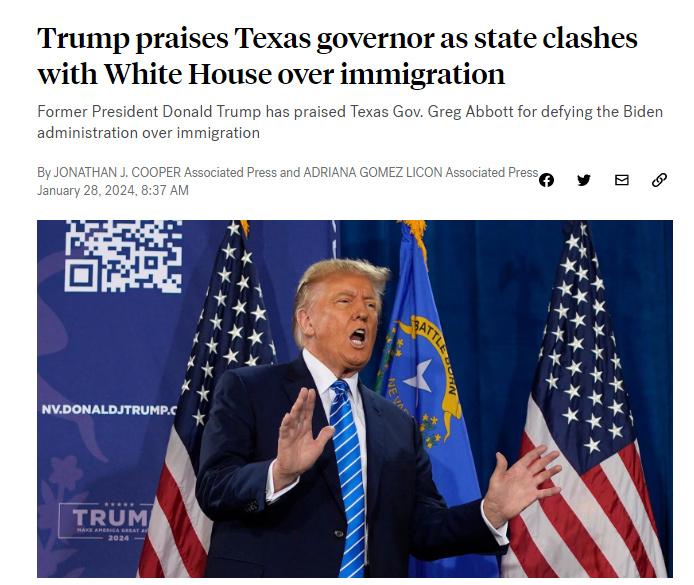 據報道,特朗普27日在一場以邊境安全為(wei) 主要議題的演講中表示,應全力支持得克薩斯州在美墨邊境采取的遏製非法移民的措施,並稱讚阿博特在該問題上采取的舉(ju) 措。