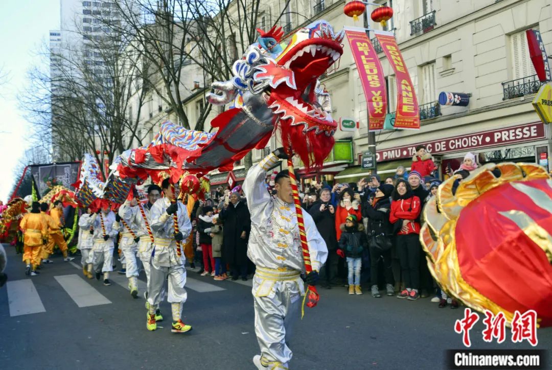 2018年,在法國巴黎十三區舉(ju) 行的春節彩妝遊行上,舞龍表演吸引市民圍觀欣賞。龍劍武 攝