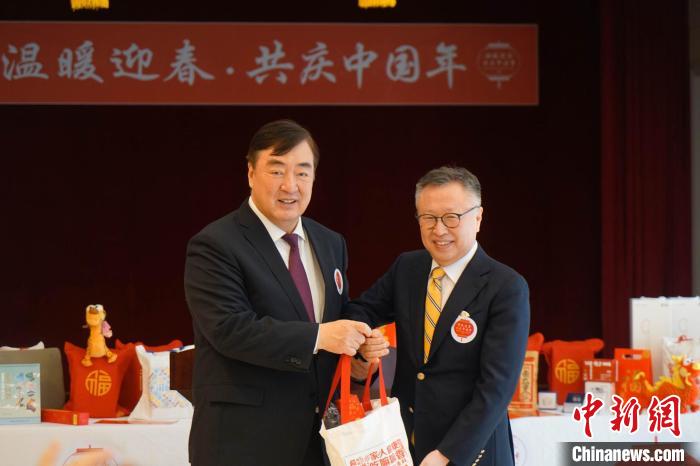 圖為(wei) 中國駐韓國大使邢海明(左)向與(yu) 會(hui) 代表發放春節包。金琳 攝