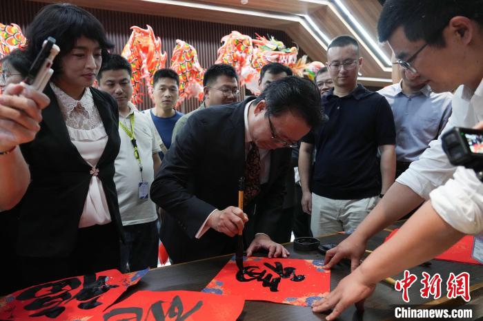 圖為(wei) 中國駐菲律賓大使黃溪連在現場書(shu) 寫(xie) 福字。張興(xing) 龍 攝