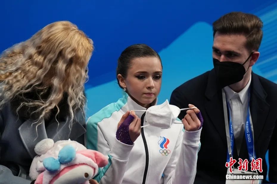 瓦利耶娃(中)在北京冬奧會(hui) 比賽結束後等待分數 資料圖 中新社記者 崔楠 攝