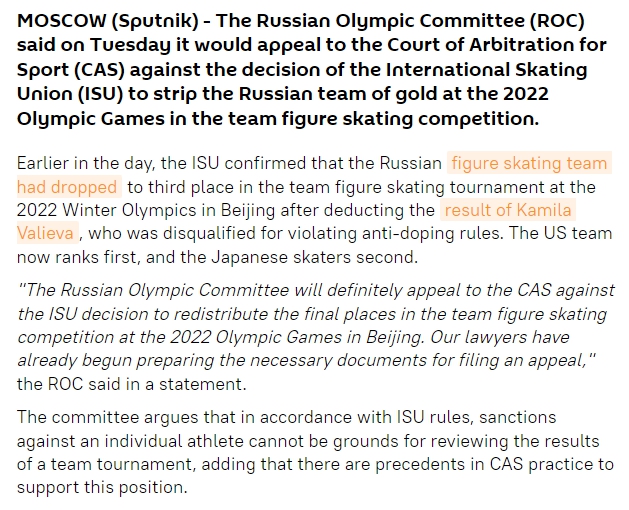 據俄羅斯衛星通訊社報道,俄羅斯奧委會(hui) 也在當地時間30日表示,將針對俄羅斯花滑運動員卡米拉·瓦利耶娃被處以禁賽並取消北京冬奧會(hui) 俄羅斯奧委會(hui) 代表團花滑團體(ti) 金牌一事,向國際體(ti) 育仲裁法庭提起上訴。