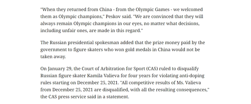 據塔斯社報道,佩斯科夫表示,無論國際體(ti) 育組織作出什麽(me) 決(jue) 定,俄羅斯人會(hui) 永遠將卡米拉·瓦利耶娃和其他花樣滑冰運動員視為(wei) 冬奧冠軍(jun) 。