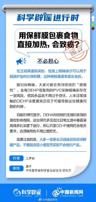 中新網1月31日電 在正規渠道購買(mai) 的,包裝上明確表示可以用於(yu) 微波爐加熱的保鮮膜,通常是安全的。提到保鮮膜,大家可能會(hui) 想到致癌的“增塑劑”。含有DEHP增塑劑的PVC保鮮膜確實存在一定風險,但其餘(yu) 品類不用過於(yu) 擔憂。(來源:@科學辟謠 中國新聞網微博)