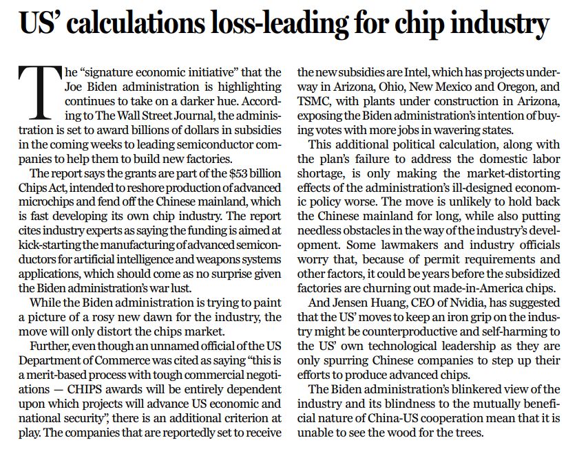 美國失策的經濟政策本已造成市場扭曲,疊加出於(yu) 政治意圖的算計,以及補貼也無法解決(jue) 的勞動力短缺問題,這一切隻會(hui) 讓扭曲態勢進一步惡化。此舉(ju) 不太可能長期遏製中國大陸,但卻給行業(ye) 發展帶來種種不必要的障礙。美國部分國會(hui) 議員及企業(ye) 高管擔心,受到許可要求及其他因素影響,享受補貼的企業(ye) 可能要花費很多年才能生產(chan) 出美國製造的芯片。