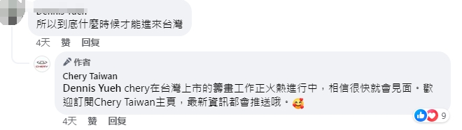 早前,奇瑞官方在臉書(shu) 創立“Chery Taiwan”,並從(cong) 去年開始更新專(zhuan) 業(ye) 內(nei) 容,針對一款中型運動型多用途汽車已多次發布宣傳(chuan) 影片。有不少台灣網友在該賬號谘詢該款汽車何時會(hui) 在台灣上市,該賬號回複,目前在台灣上市的籌劃工作正火熱進行中,相信很快就會(hui) 見麵。