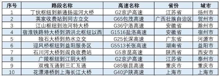 春節期間,全國高速公路預計易發生擁堵緩行的路段,如下表所示。