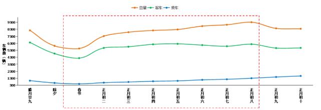 預計春節期間全國高速公路客車日均流量約4890萬(wan) 輛,小客車占客車比例預計達99%以上。貨車流量在春節節前逐日下降,在正月初一達到最低值,春節假期之後逐漸恢複到日常水平,但貨車流量同比去年預計有所增長。