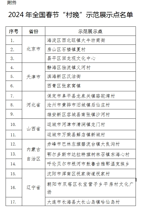 中新網2月1日電 據文化和旅遊部網站消息,文化和旅遊部辦公廳近日發布《關(guan) 於(yu) 公布2024年春節“村晚”示範展示點名單的通知》,根據文化和旅遊部春節活動有關(guan) 部署,在各省級文化和旅遊行政部門申報推薦的基礎上,文化和旅遊部研究確定了2024年春節“村晚”示範展示點名單。