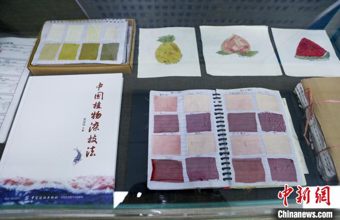 用柳葉、黃柏、欒樹等植物印染的棉、麻、絲(si) 綢,被裁剪成掌心大小的方形,按不同原料、麵料、色係分類,依次粘貼在筆記本上,一本厚如詞典。
