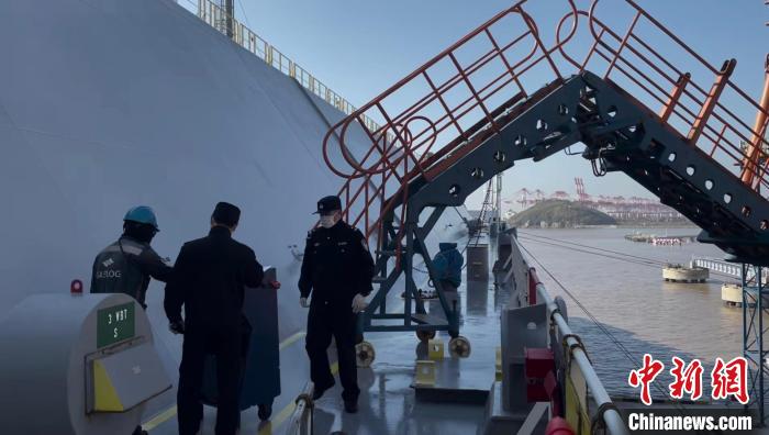 洋山邊檢站民警登輪對液化天然氣運輸船實施入境核查。(李娜 攝)