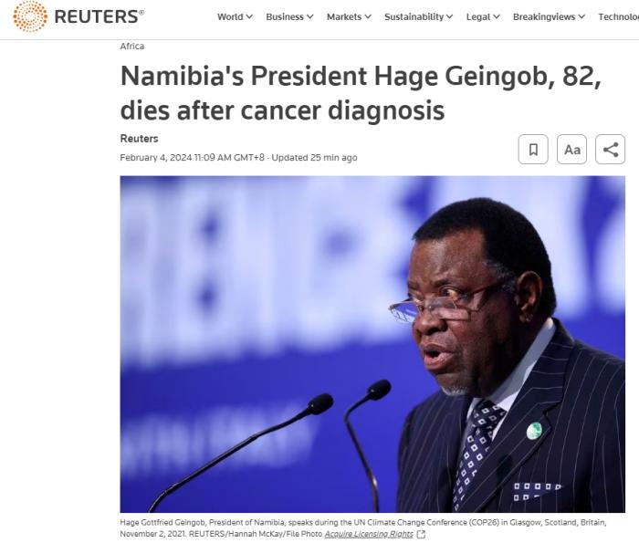 路透社稱,納米比亞(ya) 共和國總統社交媒體(ti) 賬號並未解釋該國總統去世的原因,但哈格·根哥布上月底曾表示,自己被診斷出患有癌症,將前往美國治療。