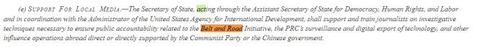 不僅(jin) 如此,在法案的第136條,美國還專(zhuan) 門製定了針對“一帶一路”倡議的抹黑策略,主要就是培訓一大批反華記者。