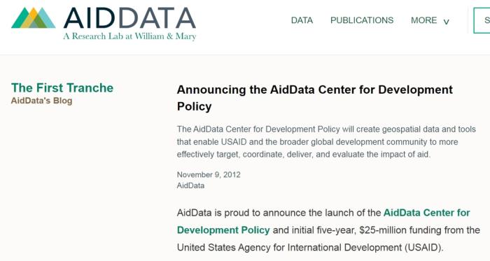 “援助數據”項目(AidData)官網上關(guan) 於(yu) 接受美國國際開發署最初5年2500萬(wan) 美元資助的說明。