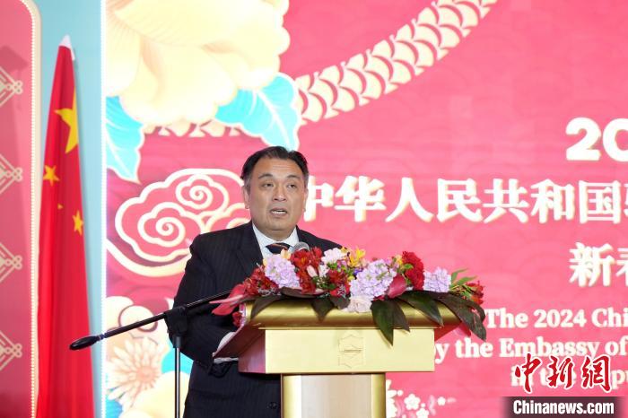 2月2日,中國駐菲律賓大使館在馬尼拉舉(ju) 辦龍年新春招待會(hui) 。圖為(wei) 菲律賓代理外長多明戈現場宣讀菲總統馬科斯新春賀詞。中新社記者 張興(xing) 龍 攝
