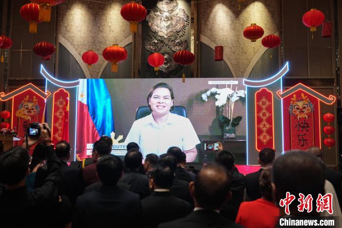 2月2日,中國駐菲律賓大使館在馬尼拉舉(ju) 辦龍年新春招待會(hui) 。圖為(wei) 菲律賓副總統莎拉視頻致辭。中新社記者 張興(xing) 龍 攝