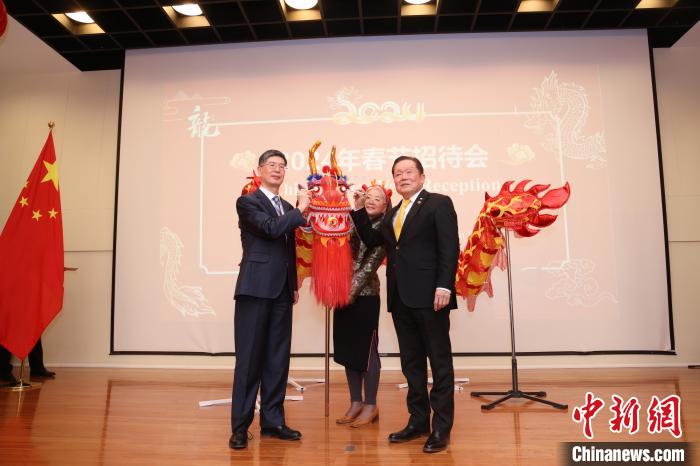當地時間2月1日晚,加拿大首都渥太華,中國駐加拿大大使館舉(ju) 行2024年春節招待會(hui) 。圖為(wei) 中國駐加拿大大使叢(cong) 培武(左)與(yu) 加拿大聯邦參議員胡子修共同為(wei) 舞龍點睛。中新網記者 餘(yu) 瑞冬 攝