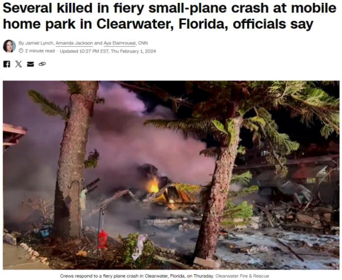 中新網2月2日電 據美國有線電視新聞網(CNN)報道,當地時間2月1日晚,一架小型飛機在美國佛羅裏達州克利爾沃特市的一處公園墜毀。