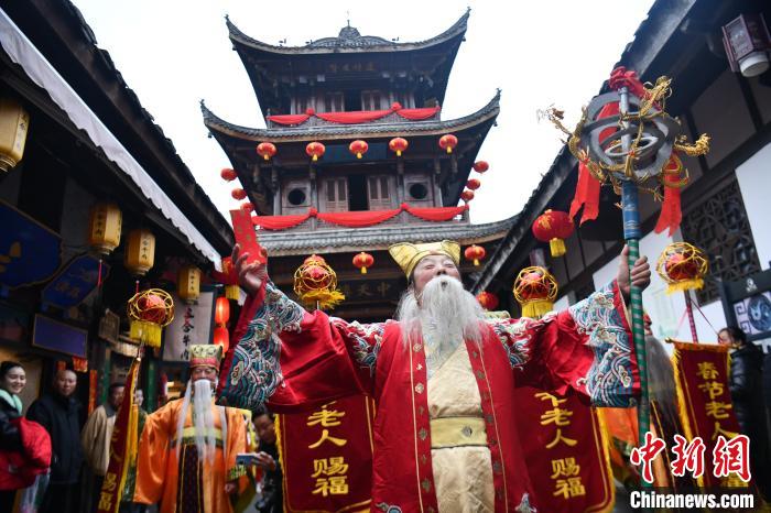 中新網閬中2月4日電 題:走進春節文化之鄉(xiang) :春倌說春迎新年 春節老人賜福忙
