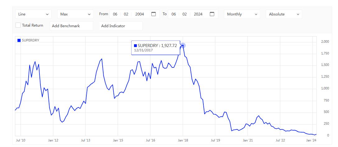 值得一提的是,倫(lun) 敦證券交易所網站顯示,Superdry的股價(jia) 曾在2017年年底達到過1927.72便士/股。