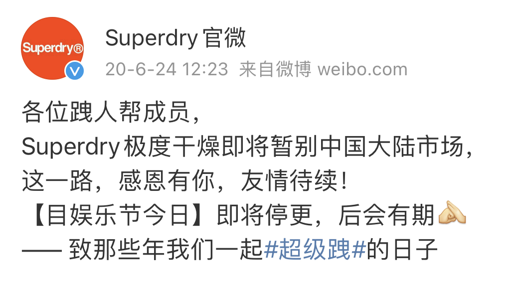 2020年6月,Superdry宣布,將暫別中國大陸市場,並稱“致那些年我們(men) 一起超級跩的日子”。