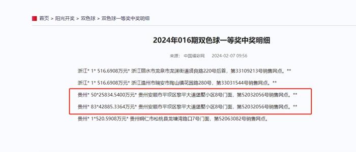 記者致電貴州省福利彩票發行中心,相關(guan) 工作人員表示,在貴州的134注一等獎中,133注為(wei) 同一銷售網點銷售,由兩(liang) 張彩票組成。銷售網點的地址為(wei) 貴州安順市平壩區黎平大道堡墅小區8號門麵,編號為(wei) 第52032056號。