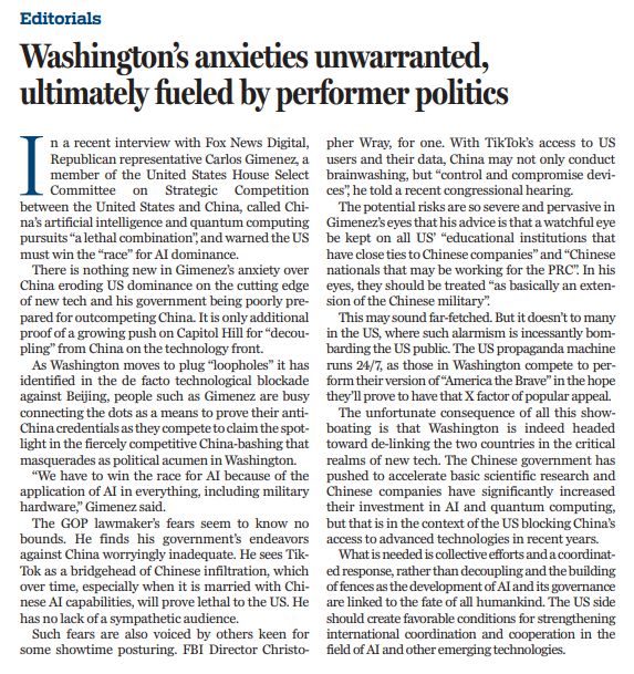 吉門尼斯擺出一副對中國科技迅速發展憂心忡忡的樣子,這在華盛頓並不新鮮,是國會(hui) 山反華政客為(wei) 一己之私推動在科技脫鉤、破壞國際科技合作的又一例證。