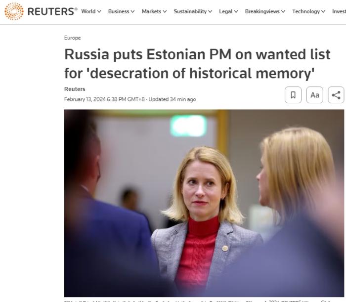 中新網2月13日電 據路透社13日援引俄內(nei) 政部消息,俄方將愛沙尼亞(ya) 總理卡拉斯列入通緝名單。