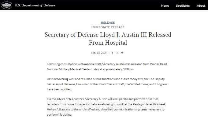 聲明稱,經過與(yu) 醫務人員協商後,奧斯汀於(yu) 13日下午3時30分左右出院。他恢複良好,並於(yu) 當日下午5時恢複了全部職能和職責。