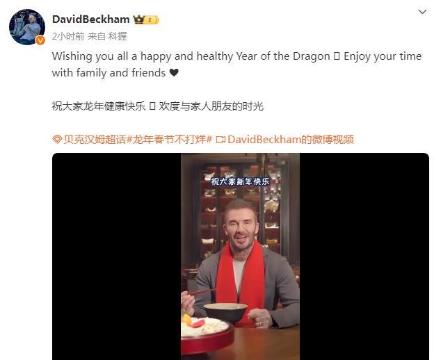 視頻中,貝克漢姆表示,“今年是特別的一年——龍年”,並用中文說道“新春快樂(le) !”隨後,他用筷子吃起了麵條。