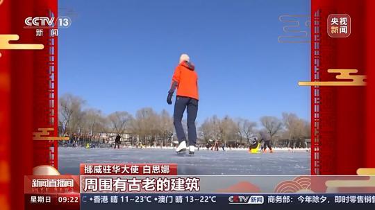 挪威駐華大使 白思娜:挪威人我們(men) 特別喜歡冬天,去爬山、滑冰、滑雪。我也很喜歡在這滑冰,因為(wei) 這裏是城市的中心,周圍有古老的建築,很多人在一起滑冰。