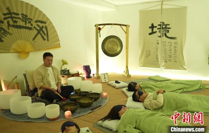 待大家緩緩躺下,蓋好被子、戴好眼罩後,魏慶宏用音錘緩緩在缽體(ti) 上摩擦、敲擊。隨著陣陣沉穩悠長的“嗡嗡”聲,顧客漸漸進入睡眠狀態。他說,來體(ti) 驗的年輕顧客居多。