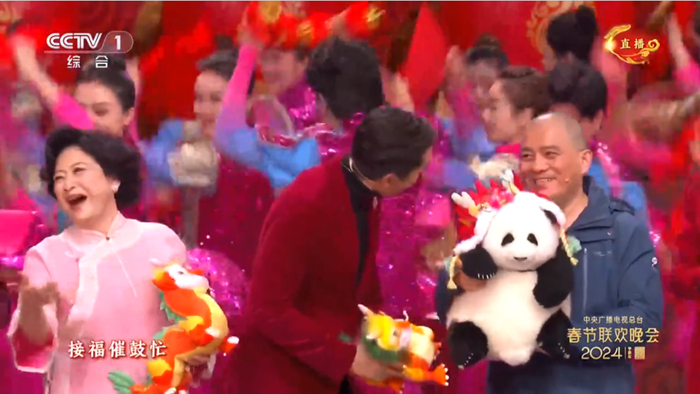 春晚觀眾(zhong) 席上,大熊貓飼養(yang) 員“譚爺爺”帶著花花玩偶一起亮相,“花花”的頭上還戴了一頂可愛的龍帽。