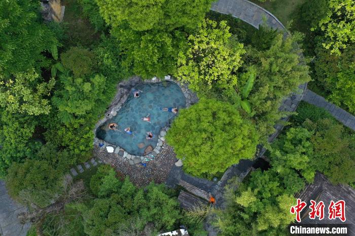 航拍民眾(zhong) 在貴州石阡古溫泉景區泡溫泉。瞿宏倫(lun) 攝