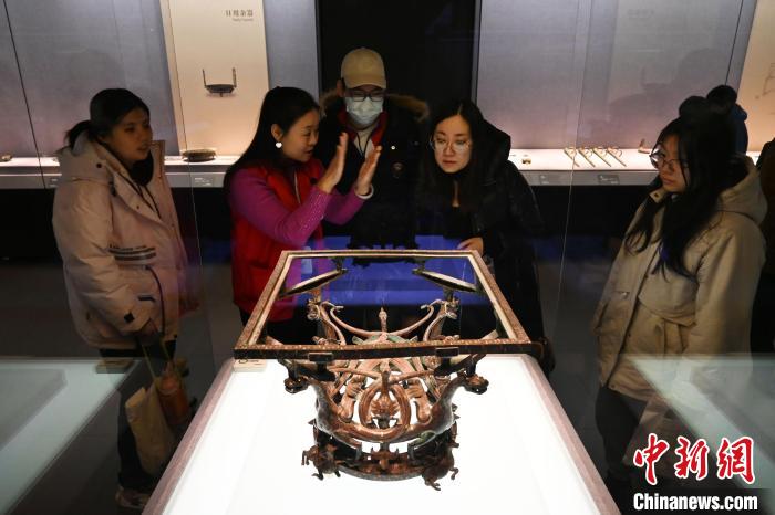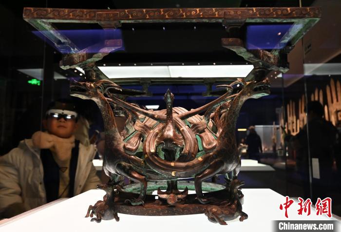2月6日,民眾(zhong) 在河北博物院“戰國雄風 古中山國”展廳參觀錯金銀四龍四鳳銅方案座。 中新社記者 翟羽佳 攝