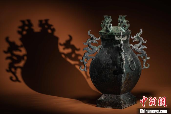 因年代久遠,錯金銀四龍四鳳銅方案座的案麵已朽,但案座依然十分精美。 中新社記者 翟羽佳 攝