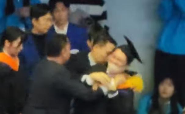 據在場人員透露,在尹錫悅致辭時,一名身穿學士服的男生麵向尹錫悅所站立的講台高喊。之後,總統警衛人員捂住他的嘴巴,並把他強行抬出會(hui) 場。