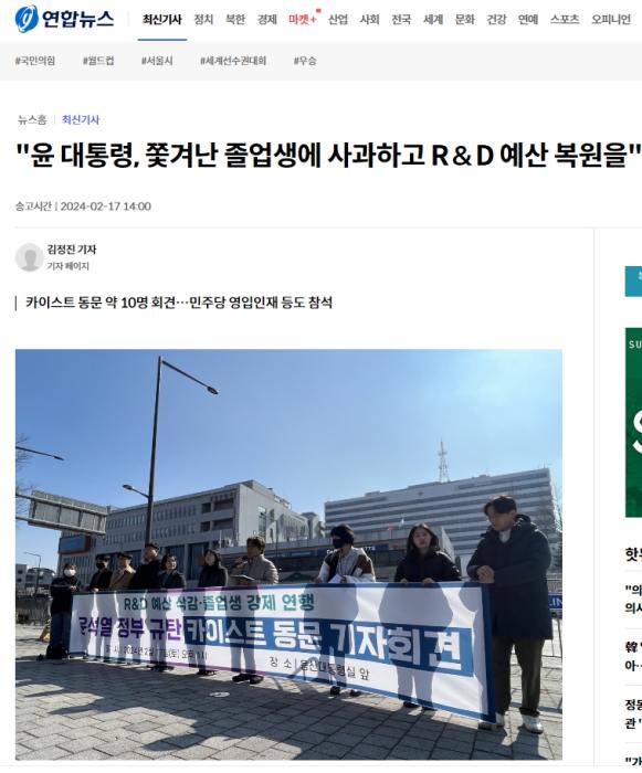17日,韓國科學技術研究院的校友在龍山總統府前舉(ju) 行記者會(hui) ,他們(men) 表示:“尹錫悅總統毫不留情地堵住畢業(ye) 生的嘴,並將其趕了出去,對此我們(men) 感到非常憤怒。”他們(men) 要求尹錫悅道歉,並恢複削減的研究與(yu) 開發預算。