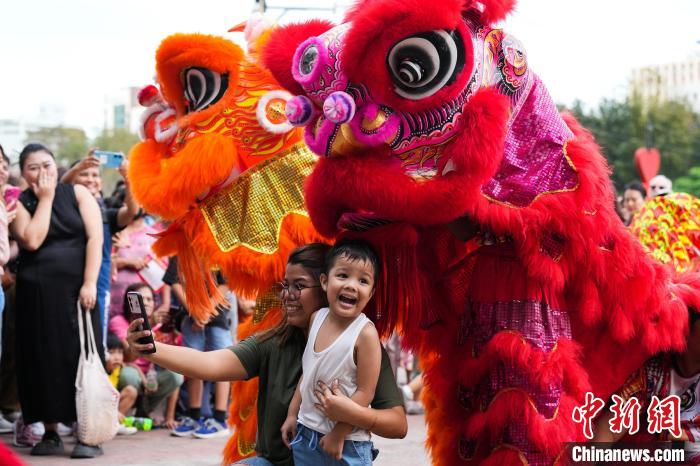 圖為(wei) 舞獅表演吸引民眾(zhong) 合影。張興(xing) 龍攝